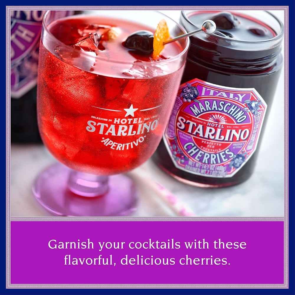 Hotel Starlino cherries are renowned for their superior quality. Grown in the heart of Italy, they boast a delightful balance of sweet and tart flavors, making them the perfect finishing touch for your cocktails.